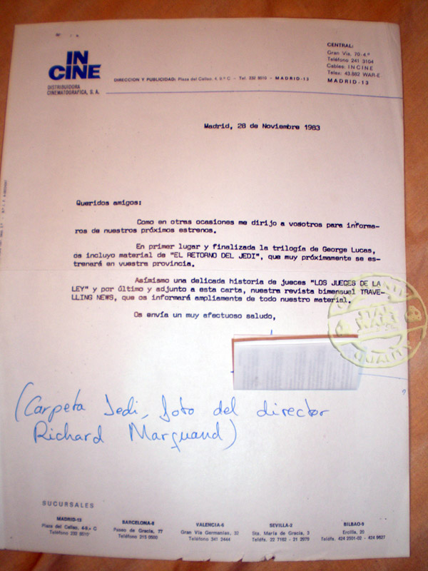 Carta de la relaciones públicas de INCINE anunciando el «inminente» estreno del Retorno del Jedi, y mandando material de prensa y el guión resumido. Atención a la fecha. 28 de Noviembre de 1983