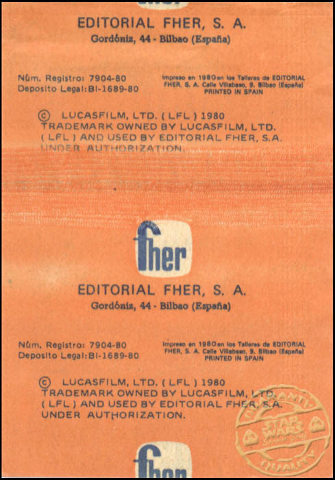 El sobre de color anaranjado tiene la misma imagen que la portada del álbum, C-3PO con el logo de El Imperio Contraataca en la parte superior, lo que cambia del álbum es el fondo, sustituyendo las naves por el interior de Halcón Milenario.De este sobre no hay otras variaciones de colores, siendo la única que se conoce.Ya por aquellos tiempos estos sobres costaban solo 5 ptas, con 6 cromos en su interior.