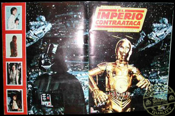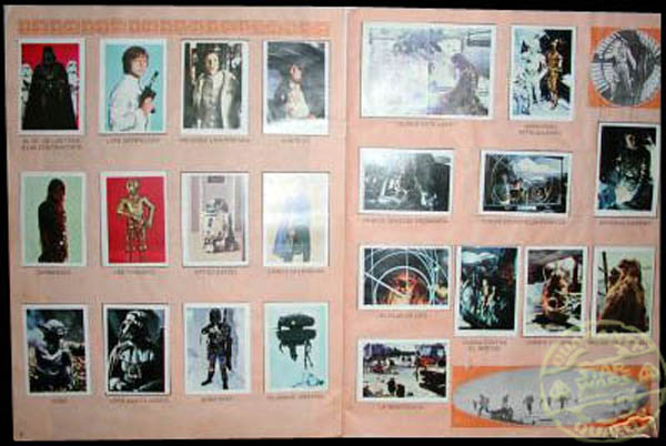 No solo nos llama la atención la falta de estos cromos si no el interior en sí, con un fondo de hojas de un simple y llamativo color salmón, con unas pequeñas imagenes en blanco y negro sobre el film,la escasa información por no decir nula de una reseña explicativa de cada imagen en la base del cromo, que en la mayoría de los casos es de lo mas simple y vacía, hace que ésta colección sea sin duda la más deficiente entre todos los albumes publicados sobre la saga Star Wars.