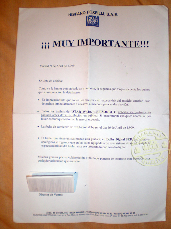 Carta que venía en las «latas» del Trailer del Ep.I, dirigida a los jefes de las Salas de proyecciones, donde ordenaba la devolución inmediata del Trailer a efectos de destruirlos y, así, evitar su difusión incontrolada. Sólo hay constancia de dos trailers ilesos, y sólo uno completo con el certificado del Ministerio de cultura y la carta en cuestión