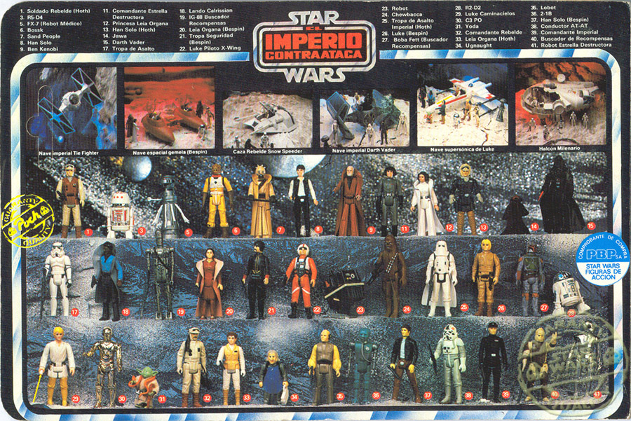 -ESB 37/41 back «Poch» tipo «A» : El frontal es como el ESB 31 Back aunque en esta la segunda serie de personajes SW y la primera de ESB están designados con 4 dígitos en su parte superior izquierda. La parte trasera es presentada de forma horizontal y al pesar de listar 41 personajes solo salen 37 en fotos. Aun es un misterio porque no han mostrado las fotografías de los 4 aliens de la cantina sobre este blister (Hammerhead, Greedo, Snaggletooth y Walrus Man). Pero se sabe que España ha producido durante un periodo estos 4 personajes exclusivamente para el mercado americano. Aun, hoy en día se encuentran estos 4 aliens en blister «Kenner» con «Made in Spain» en el trasero del blister. Las esquinas siguen redondeadas arriba y cuadradas abajo.