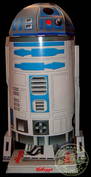 Aqui podemos ver las 4 caretas que Kellogg’s regalaba en los hipermercados con la compra de sus productos durante la campaña promocional, asi como alguno de los expositores, mas concretamente un R2-D2 y el el expositor de las tazas de los supermercados.
