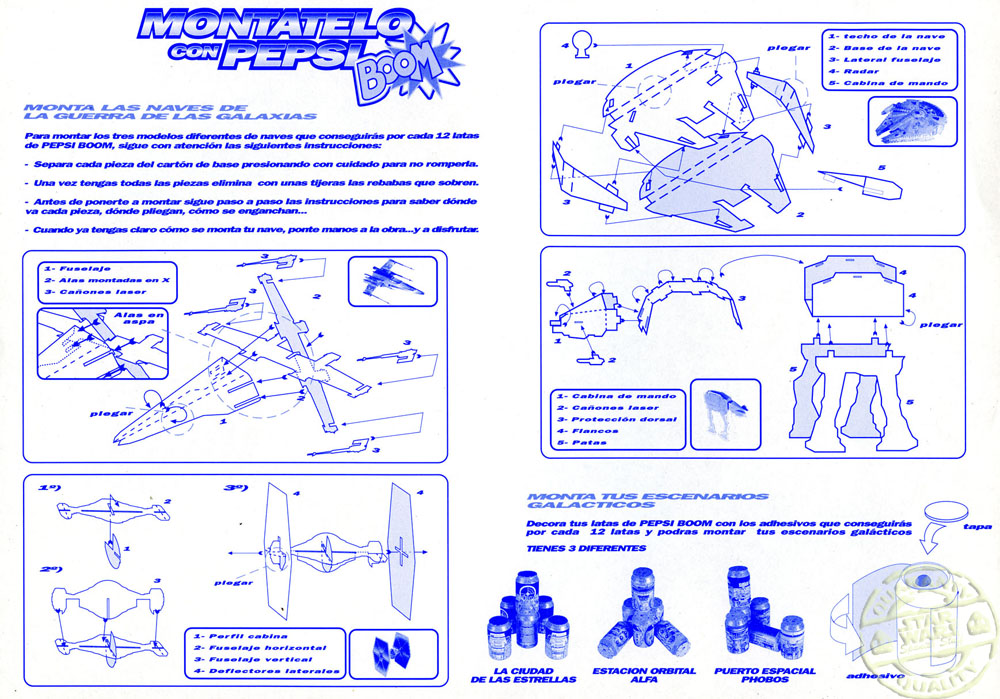 Y junto con la hoja de troquelados también unas pegatinas para pegar en las latas y así realizar distintos escenarios y una hoja con las instrucciones. Los sobres se regalaban en los supermercados de El Corte Ingles, aunque es posible que también se repartiera en otros súper e hipermercados, con la compra de las latas o botellas de Pepsi Boom.